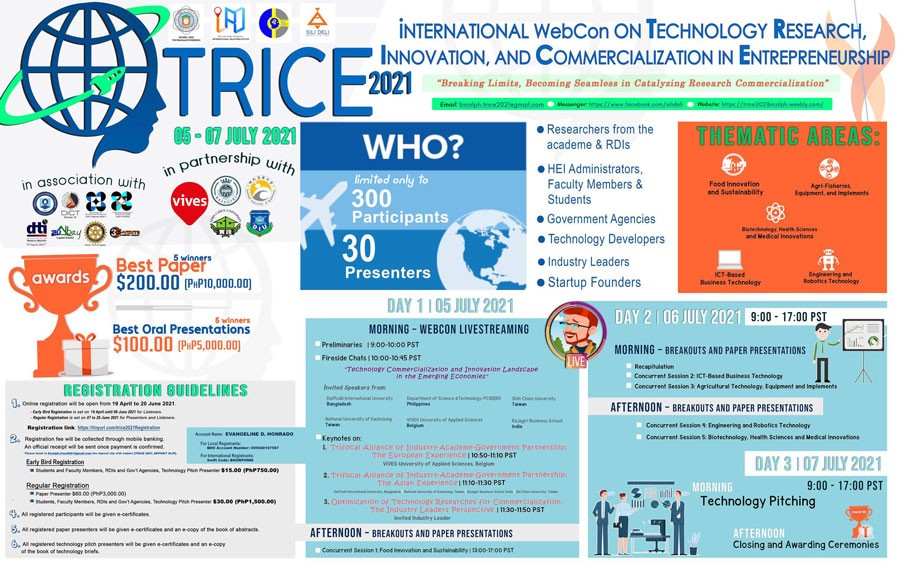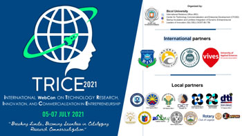 Bicol University, Philippines is organizing International WebCon on Technology Research, Innovation, and Commercialization in Entrepreneurship (TRICE) 2021 to come 05-07 July 2021 in partnership with Daffodil International University-Bangladesh, National University of Kaohsiung-Taiwan, Rajagiri Business School-India, Shih Chien University-Taiwan & VIVES University of Applied Sciences-Belgium.