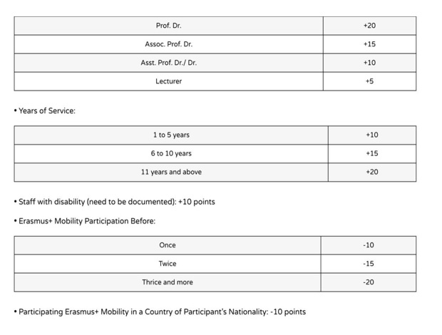 Selections are carried out by ranking the points from the highest to the lowest, considering the evaluation criteria and weighted scores announced by HEIs among the staff who fulfill the minimum requirements. The selection criteria should be fair, transparent, and objectively applicable to all potential beneficiaries.
