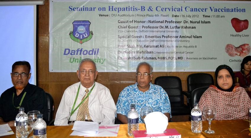 Department of Public Health of Daffodil International University in collaboration with Ibn Sina Trust jointly organized the seminar on Hepatitis B & Cervical Cancer Vaccination on July 16, 2012 at DIU Auditorium for creating mass awareness regarding the hazardous disease “Hepatitis- B & Cervical Cancer” and its remedial measures along with the use of vaccination for curing this disease.