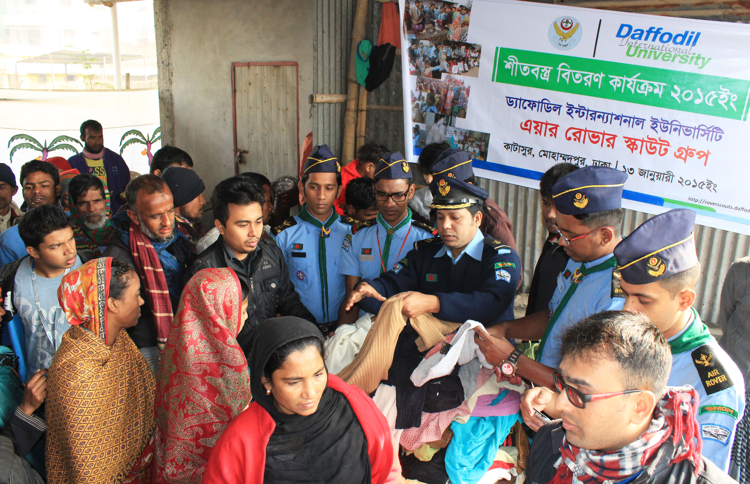 Members of DIU Air Rover Scout Group of Daffodil International University distributed warm clothes among the victims of fire incidents recently took place at Pulpar Slums of Katasur under Mohammadpur Thana in the capital on January 13, 2015. A team comprising 22 Rover Scouts led by Rover Scout Leader Md. Shaiful Islam and took part in the program. 800 destitute winter affected people were given winter clothes under the guidance of local people.