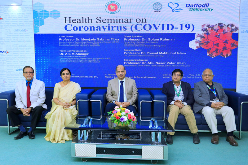 Professor Dr. Meerjady Sabrina Flora, Director, Institute of Epidemiology, Disease Control and Research (IEDCR), Government of Bangladesh; and the national spokesperson on Coronavirus was present at the seminar as the chief guest. Professor Dr. Golam Rahman, Former Chief Information Commissioner, Information Commission, Government of Bangladesh was present as the special guest. Dr. A S M Alamgir, Principal Scientific Officer, IEDCR presented the technical briefing on the latest situation on Coronavirus in the seminar. Professor Dr. Yousuf Mahbubul Islam, Vice Chancellor, DIU presided over the seminar. The seminar was addressed by Professor Dr. S M Mahabub Ul Haque Majumder, Pro Vice Chancellor, Professor Dr. Ahmad Ismail Mustafa, Dean, FAHS, DIU, Professor Dr. A N Zafar Ullah, Associate Dean, Faculty of Allied Health Science, DIU.