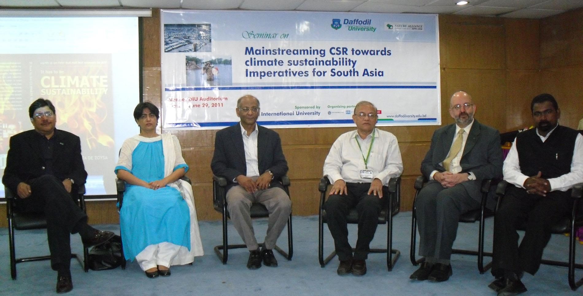 DIU organized an International Seminar on "Mainstreaming CSR towards climate sustainability: imperatives for South Asia". Dr. Faiz Shah, Ms. Ambreen Wahid, Mr. Mohiuddin Babar, Prof. Dr. M. Lutfar Rahman, Rodny Reed, and Uchita De Zoysa were present at the seminar. Various issues on climate sustainability through corporate social responsibility were discussed in the seminar.
