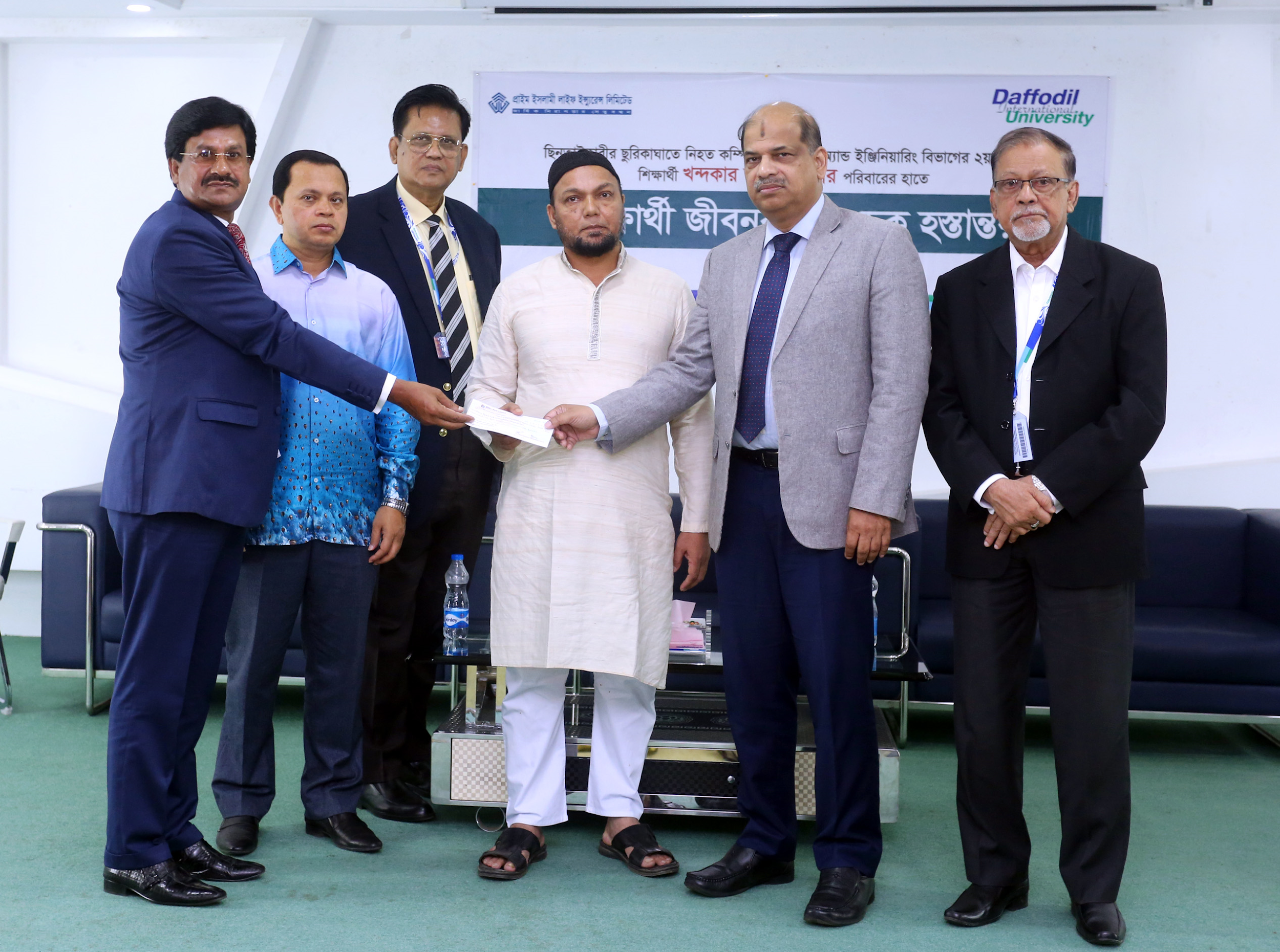 Daffodil International University announces an educational scholarship naming after Khondoker Abu Talha who was killed by the muggers when he was trying to stop and catch several muggers. Beside this, the university authority handed over a cheque of Tk. 5 lac of Prime Islami Life Insurance Ltd. as student life insurance coverage to his father Abu Reaz Md. Nuruddin Khondoker. Mr. Md. Sabur Khan, Chairman, Board of Trustees, Daffodil International University was present as the chief guest at the program.