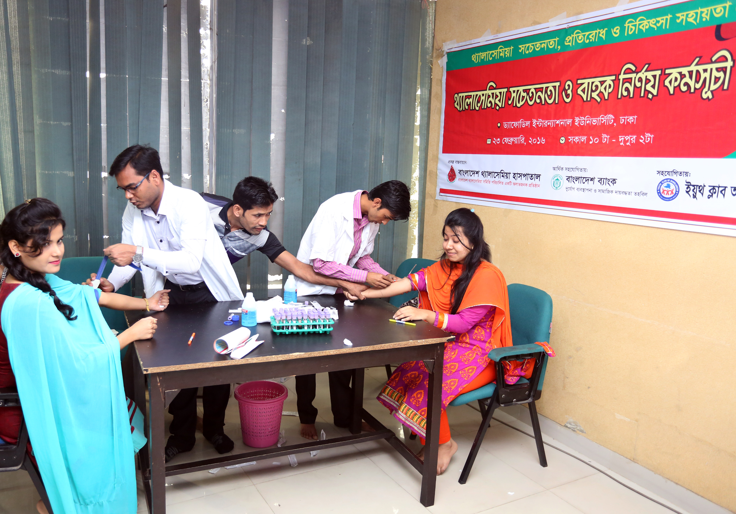A campaign on “Thalassaemia Prevention; Carrier Detection Campaign” was held on 23rd February, 2016 at the Student Lounge of Daffodil International University (DIU). This campaign is implemented under a the “Thalassaemia Awareness, Prevention & Treatment Supporting Project” organized by Bangladesh Thalassaemia Hospital with the financial assistance of Bangladesh Bank. The campaign is supported by Youth Club of Bangladesh and Daffodil International University Voluntary Service Club (DIUVSC).