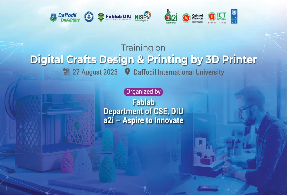 FabLab DIU is excited to announce its upcoming workshop on "Training session on Digital Crafts Design & Printing by 3D Printer" on Sunday, 27th August 2023 Supported by a2i.