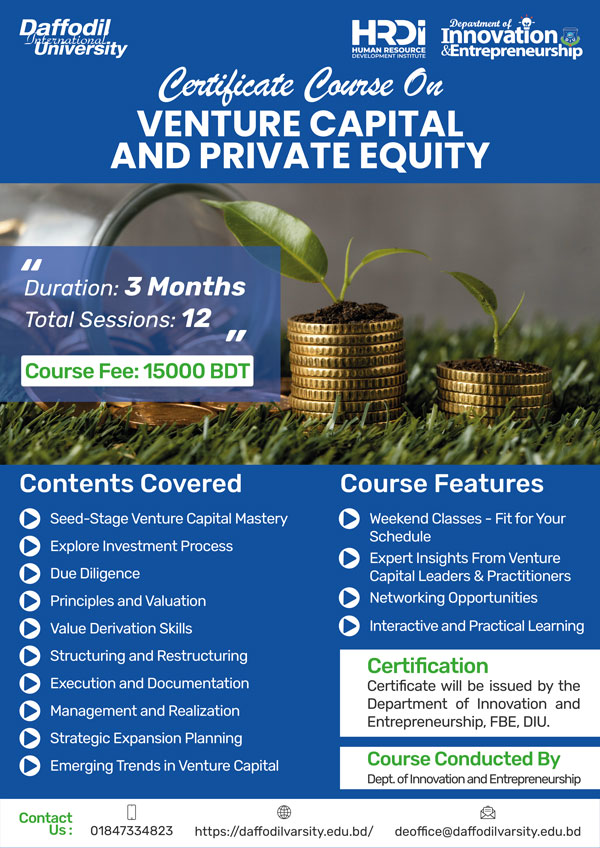 | Certification | Participants who successfully complete the course will receive a certificate of completion in "Venture Capital and Private Equity." Offered by Department of Innovation & Entrepreneurship and signed by Vice-Chancellor of Daffodil International University |