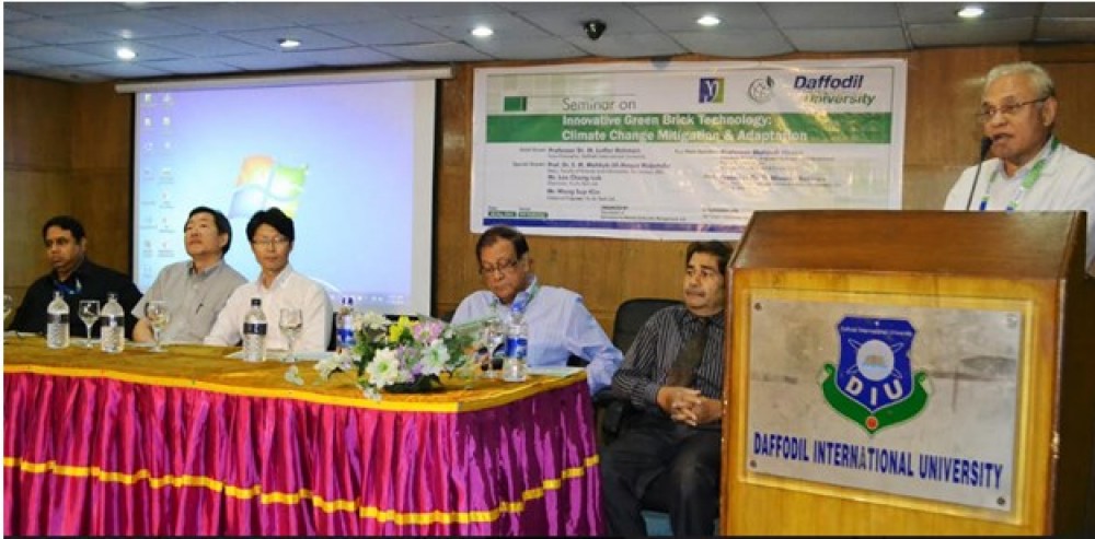 The Department of Environmental Science & Disaster Management (ESDM) of Daffodil International University (DIU) organized a seminar on ‘Innovative Green Brick Technology: Climate Change Mitigation & Adaptation’ in association with Yu Jin Tech and ASP Green Technology Ltd on 26 May 2014 in the DIU Auditorium. Speakers at the seminar stressed the importance of motivating people to act collectively to implement environment friendly green technology to transform the traditional brick sector into an improved & well regulated industry. Prof. Dr. S.M. Mahbub-Ul-Haque Majumder, Dean, Faculty of Science and Information Technology, DIU; Mr. Lee Chong Luk, Chairman, Yu Jin Tech Ltd.; and Mr. Wang Sup Kim, Chemical Engineer, Yu Jin Tech Ltd. were present as Special Guests. Professor Mahbub Hasan, Executive Director, Engineering Resources International (ERI), presented the keynote paper at the seminar.