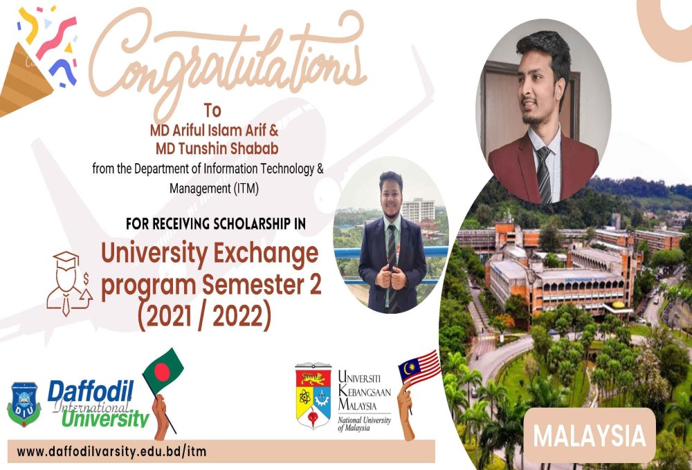 We are cordially congratulating our beloved students (Md Tunshin Shabab - ID: 201-51-013 & Tasdeeal Arif - ID: 201-51-009 ) to get scholarships and enrol in the Universiti Kebangsaan Malaysia - UKM. They were admirably selected for the university exchange program at Daffodil International University. We wish you good luck.