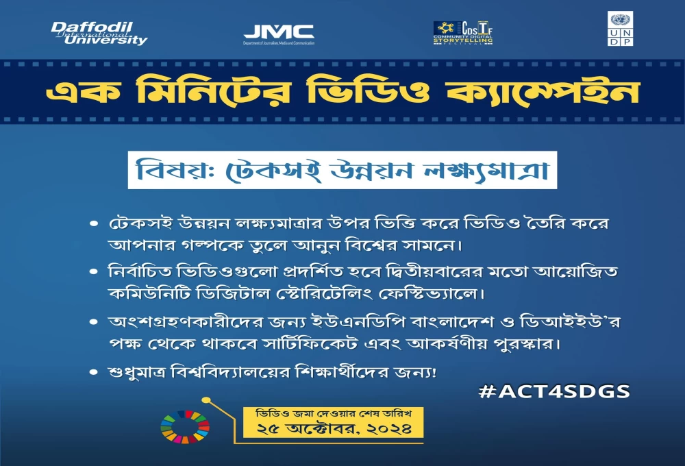 The United Nations Development Programme in Bangladesh and the Department of Journalism, Media and Communication, Daffodil International University, have jointly launched a 'One-Minute Video Campaign' to encourage youth participation in achieving the Sustainable Development Goals (SDGs). The primary goal of this initiative is to raise awareness among young content creators about the SDGs and to work together toward achieving these targets.