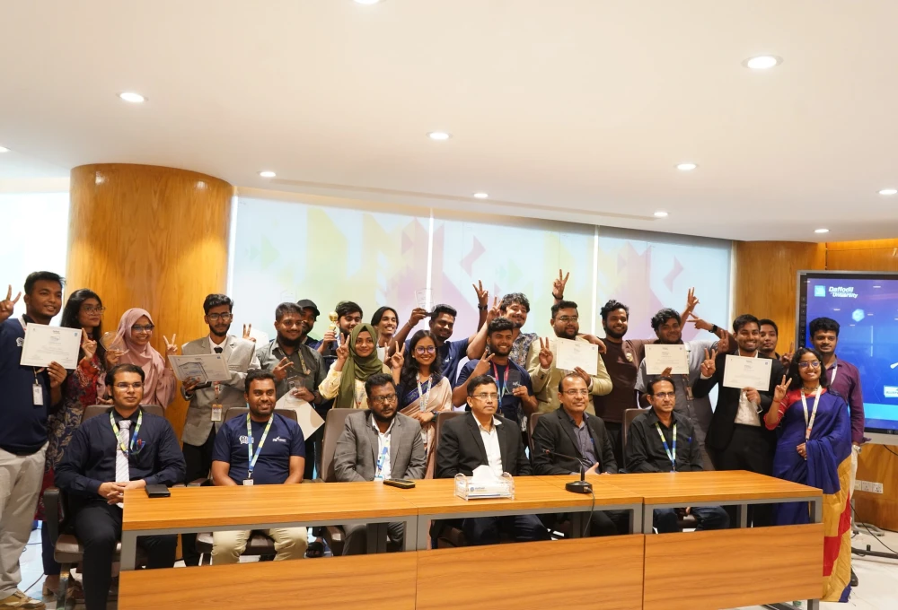 Distinguished guests along with the participating students of MCT Department of Daffodil International University pose for a photograph after 5 seminars on “Opportunities for Bangladesh”, Case study of instant gaming portal, Esports opportunity in Bangladesh, NFTs, more than just your Web3 identity and Journey into Metaverse.