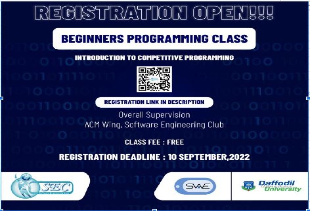 One of the most important section of DIUSEC ACM Wing organized a free one month long beginners programming classes. It was a great initiative because dept of SWE is fully curriculamed with programming.This session helped freshers having a suitable path to achieve this.