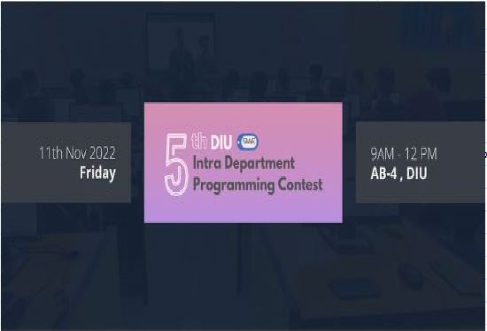 DIU 5th Intra Department Programming is going to be held in 11th Nov 2022.It is a solo competition using programming knowledge. 1st to 4th semester students can participate in this contest only.