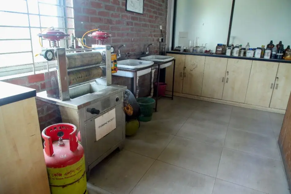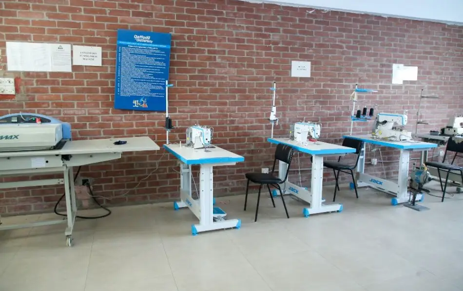 The Knitting Lab in the DIU Textile Engineering Department is dedicated to exploring and learning about various knitting techniques, equipment, and fabrics. Students gain hands-on experience with both weft and warp knitting machines, studying the structural properties and mechanics of knitted fabrics. This lab helps students understand the production process of knitwear and analyze the resulting fabric characteristics, preparing them for roles in knitwear manufacturing and quality control.
