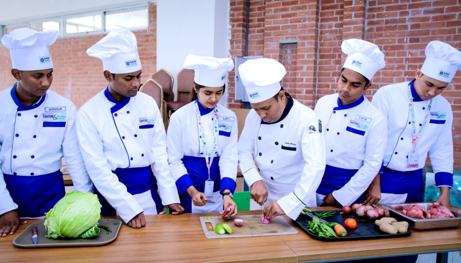 The Main Kitchen: Food and Beverage Production Lab for students is a hands-on learning space where aspiring chefs develop practical skills. Equipped with modern tools, students explore the food production process, focusing on ingredient selection, safety, and presentation. This dynamic environment fosters creativity and teamwork, preparing them for successful careers in the culinary industry.