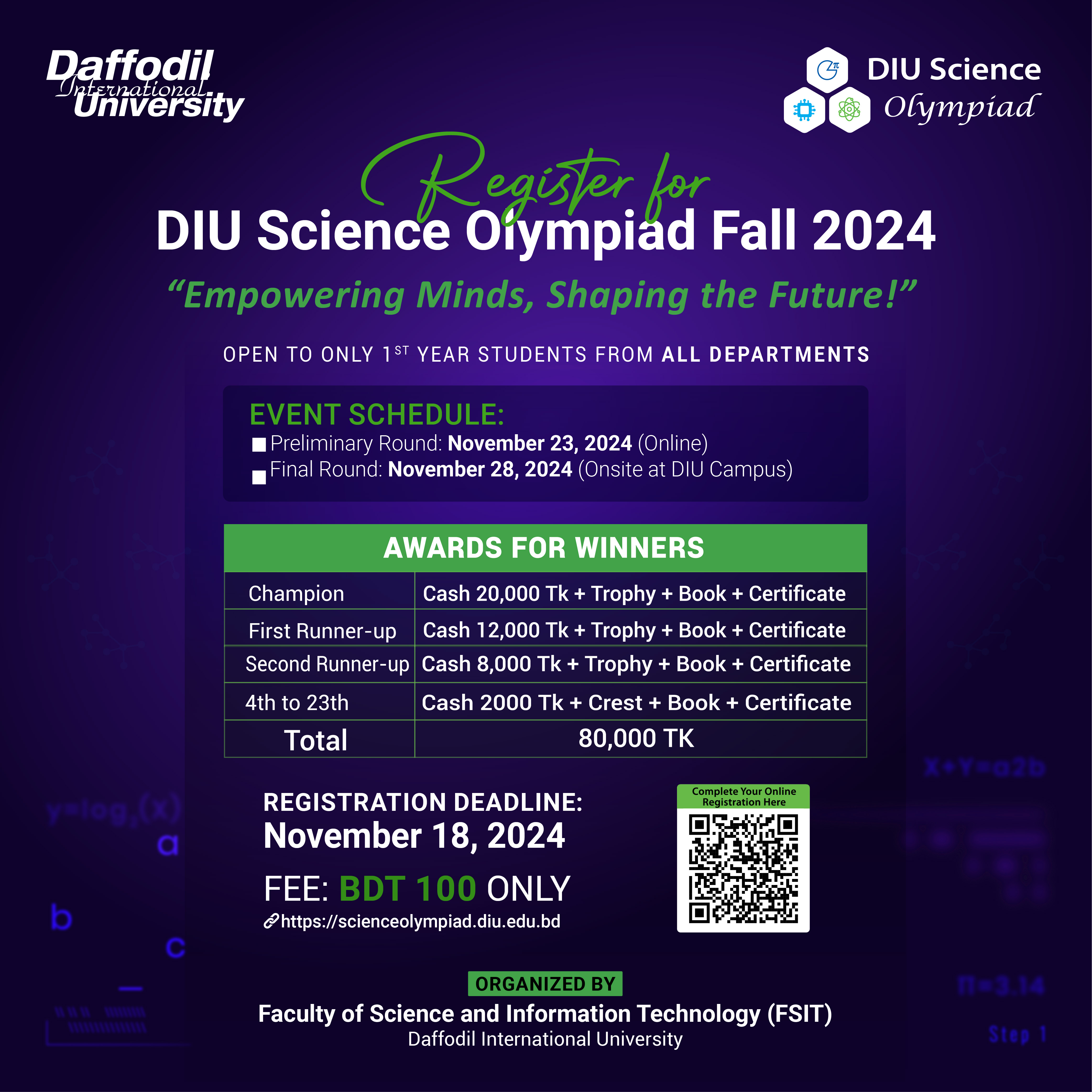 It is our pleasure to inform you that the Faculty of SIT is going to organize DIU Science Olympiad-Fall 2024 among the first year students of DIU according to the following schedule: