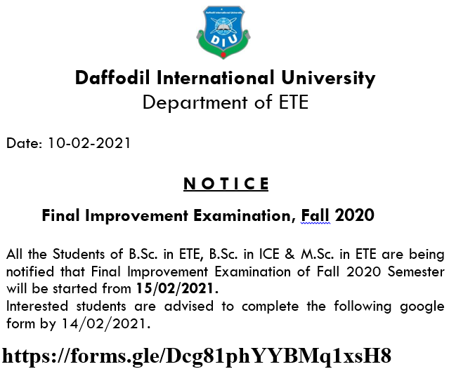 All the Students of B.Sc. in ETE, B.Sc. in ICE & M.Sc. in ETE are being notified that Final Improvement Examination of Fall 2020 Semester will be started from 15/02/2021.